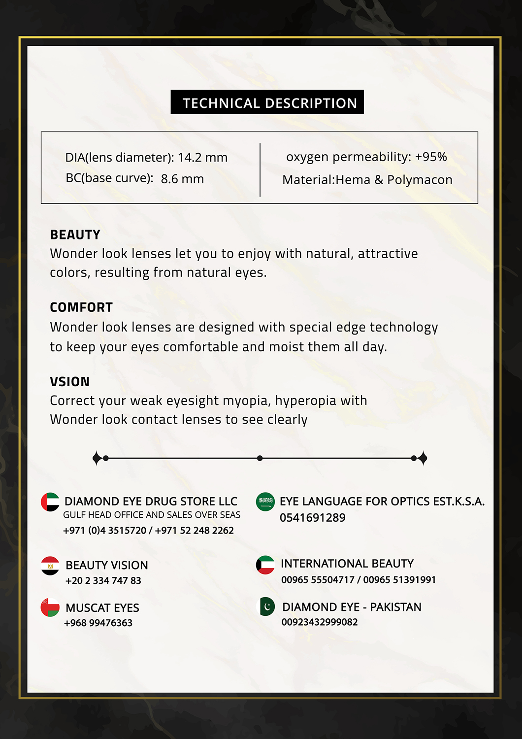 Now you can match your eye color with your dress style and get a new look with natural and attractive soft colored contact lens at the best price. Be sure to get these amazing colors from Wonder Look, a brand owned by Diamond Eye.
